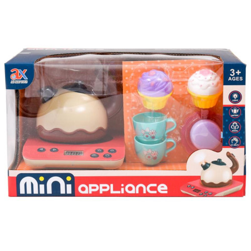 В наборе есть чайник и многофункциональная электроплита, со звуковыми и световыми эффектами, а также эффектом пара. Также в комплекте чашки и кексы.