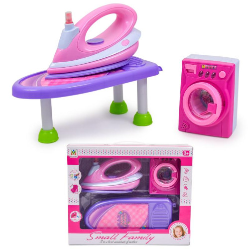 Набор содержит: утюг, гладильную доску, стиральную машинку.