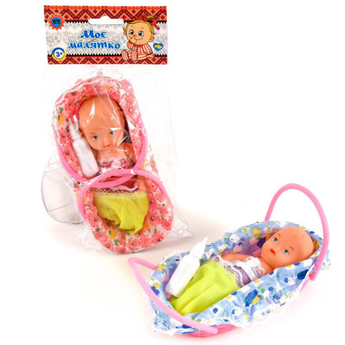 Длина игрушки 15 см. Пупс лежит в нарядной пластиковой корзинке с ручками, в тканевом чехле.