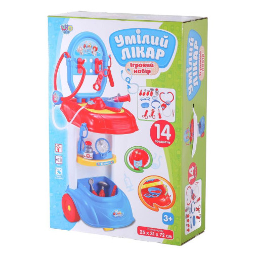 Ваш малыш мечтает стать доктором? Тогда эта замечательная тележка создана специально для него! В наборе есть все необходимые инструменты: стетоскоп, шприц, очки, ножницы, баночки с лекарствами и многое другое.