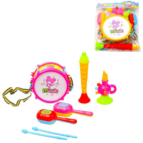 В наборе: барабан 12 см в диаметре, палочки 2 шт., свисток 17 см, дудка 12 см, маракасы-погремушки 2 шт.