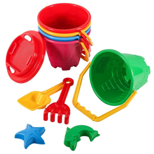 Комплектація - відерце з ручкою, сито, лопатка, граблі, формочки.