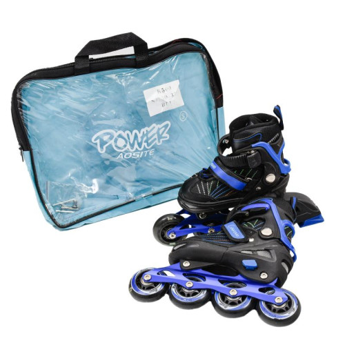 Ролики раздвижные, регулируются за счёт шнуровки и бакли. Рама алюминиевая, колёса из полиуретана, диаметр 64 мм, переднее колесо светится при движении. Цвет синий. Размер 30-33.
