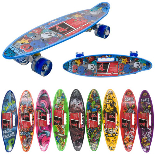 Скейт Пенни – это доска для активного отдыха, которая прекрасно подойдёт ребенку от 5-ти лет. Данный вид скейтбордов отличается особой прочностью, мобильностью и яркостью. Дека скейта изготовлена из жесткого материала с антискользящей поверхностью, маленькие светящиеся ПУ колёса диаметром в 6 см, пластиковая подвеска.