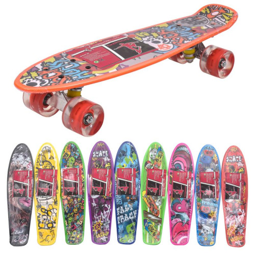 Скейт Пенни – это доска для активного отдыха, которая прекрасно подойдёт ребенку от 5-ти лет. Данный вид скейтбордов отличается особой прочностью, мобильностью и яркостью. Дека скейта изготовлена из жесткого материала с антискользящей поверхностью, маленькие светящиеся ПУ колеса, пластиковая подвеска.