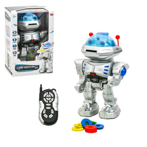 Робот д/в (ІЧ), 30см, муз, зв (англ), світло, ходить, стріляє дисками, бат, в кор-ці, 21,5-32-15,5см