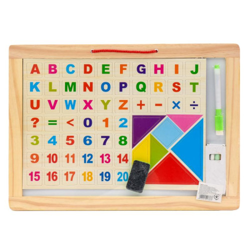 В наборе: доска для рисования, мелки, маркер, губка, лист с буквами-вкладышами.