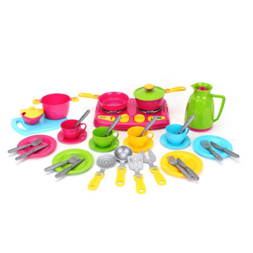 Пластиковый набор посудки из 38 предметов. В комплекте: плита, графин с крышечкой, 3 блюдца, 4 чашечки, 4 чайных ложечки,сахарница с крышечкой, 4 тарелки, 4 пары столовых приборов (вилка и нож), кастрюлька с крышечкой, кастрюлька с ручкой, доска, 4 прибора для готовки, сковородка.