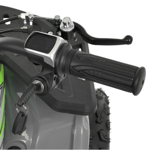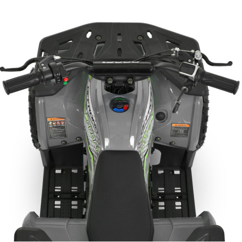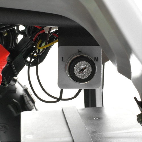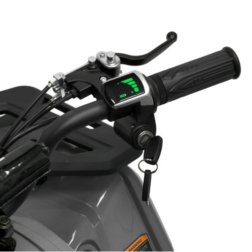 Квадроцикл оснащен бесщеточным двигателем мощностью 1000W и аккумуляторной системой на 48V, что позволяет развивать скорость до 25 км/ч. Предусмотрены три скоростных режима, которые переключаются поворотом ключа под сиденьем. Запуск осуществляется поворотом ключа, управления – с помощью ручки газа и кругового переключателя направления движения.
