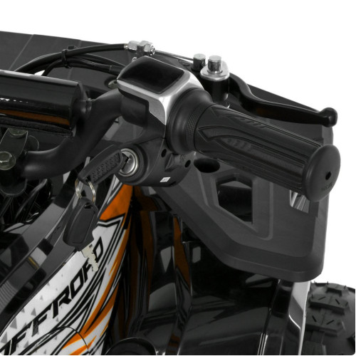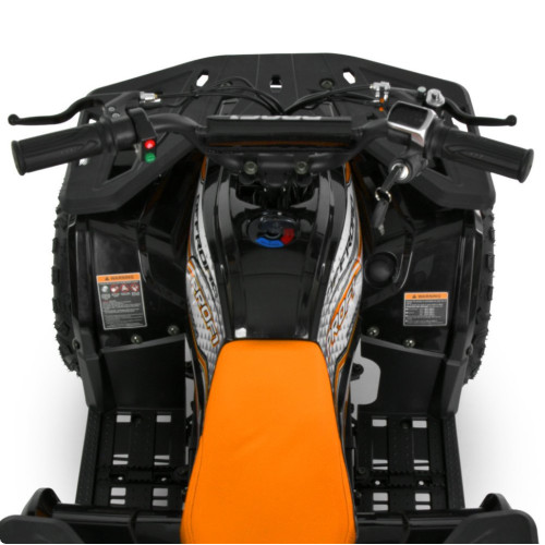 Квадроцикл оснащен бесщеточным двигателем мощностью 1000W и аккумуляторной системой на 48V, что позволяет развивать скорость до 25 км/ч. Предусмотрены три скоростных режима, которые переключаются поворотом ключа под сиденьем. Запуск осуществляется поворотом ключа, управления – с помощью ручки газа и кругового переключателя направления движения.