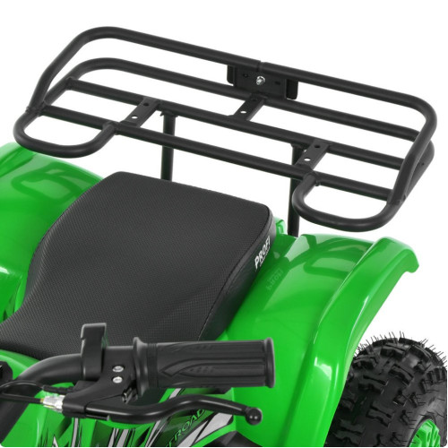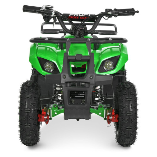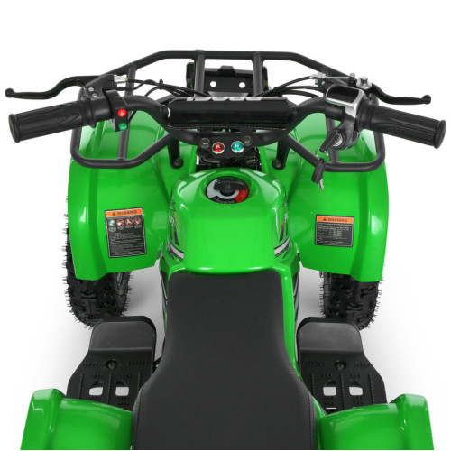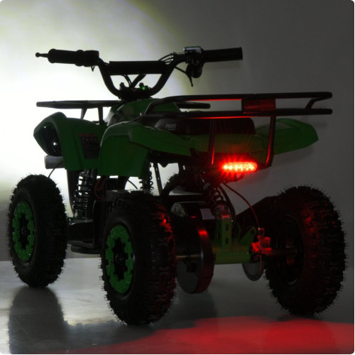 Квадроцикл оборудован надувными резиновыми колесами, обеспечивающими хорошее сцепление с поверхностью. Передние и задние амортизаторы с регулировкой жесткости эффективно смягчают неровность дороги. Дисковый тормоз спереди и сзади гарантирует надежное торможение, а цепная передача обеспечивает передачу мощности от двигателя.
