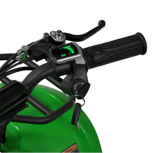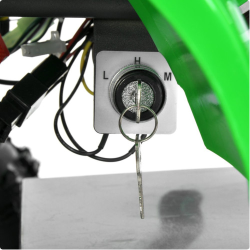 Модель оснащена электродвигателем мощностью 1000W, позволяющим развивать скорость до 23 км/ч. Предусмотрены три скоростных режима с возможностью переключения, что позволяет выбрать оптимальный темп движения. Запуск производится поворотом ключа, управления – ручкой газа и тумблером для движения вперед и назад.
