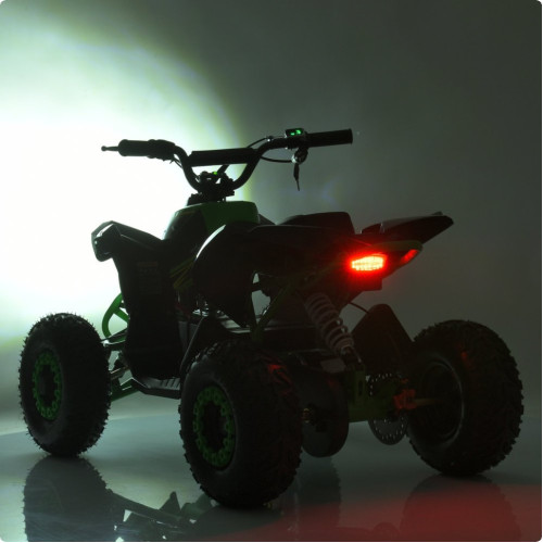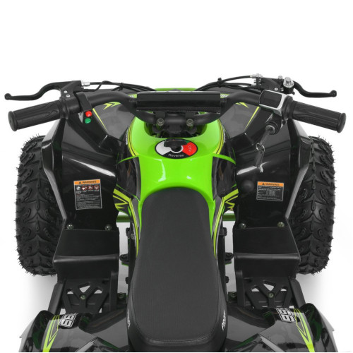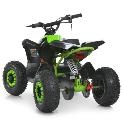 Квадроцикл оборудован большими надувными колесами, обеспечивающими надежное сцепление с поверхностью. Передние и задние амортизаторы с возможностью регулировки жесткости эффективно поглощают неровности. Дисковые тормоза спереди и сзади обеспечивают контролируемое и безопасное торможение, а цепная передача отвечает за передачу мощности.