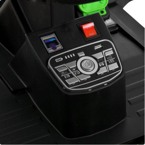 Управление реализовано с помощью педали газа и тормоза, а также кнопки переключения направления движения вперед/назад. Дополнительно есть пульт дистанционного управления с возможностью регулировки скорости (2 скорости на панели и 3 на пульте), что позволяет родителям контролировать процесс катания.