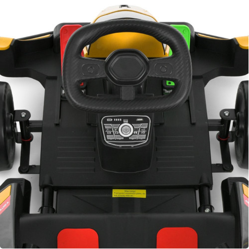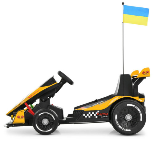 Карт оснащен двумя мощными моторами по 150W и аккумулятором 24V 14Ah, что обеспечивает отличную динамику и скорость до 10 км/ч. Предусмотрен плавный старт для безопасного начала движения. Запуск производится кнопкой со звуковым эффектом.