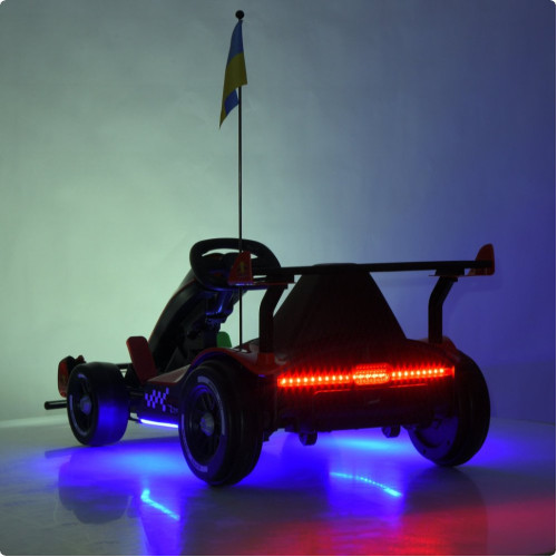 Карт оснащен двумя мощными моторами по 150W и аккумулятором 24V 14Ah, что обеспечивает отличную динамику и скорость до 10 км/ч. Предусмотрен плавный старт для безопасного начала движения. Запуск производится кнопкой со звуковым эффектом.