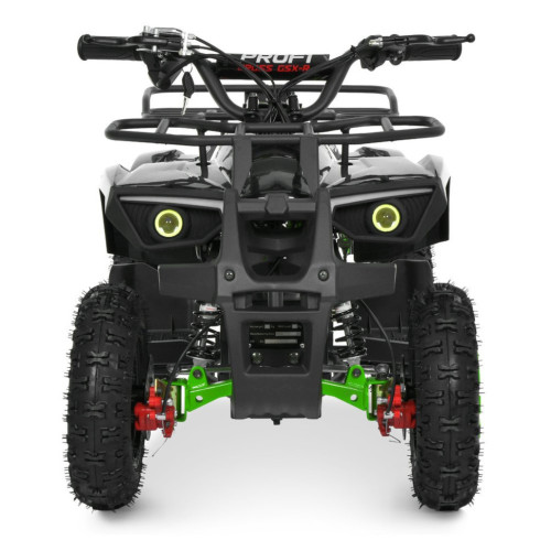 Квадроцикл оборудован надувными резиновыми колесами большого диаметра, обеспечивающими хорошее сцепление с поверхностью. Передние и задние амортизаторы с регулировкой жесткости эффективно впитывают неровности дороги. Дисковый тормоз спереди и сзади гарантирует надежное торможение, а цепная передача обеспечивает эффективную передачу мощности.