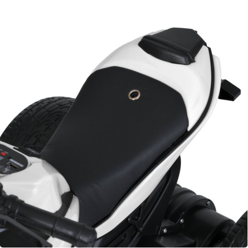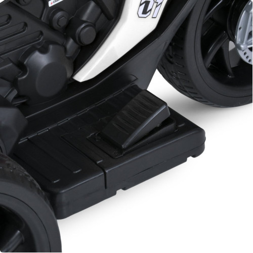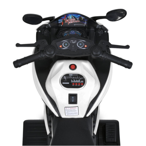 Мотоцикл оснащен двумя моторами по 35W и аккумулятором 6V 5Ah, что обеспечивает стабильное движение со скоростью до 3 км/ч – безопасный темп для детей. Запуск производится с помощью тумблера и сопровождается звуковым эффектом.