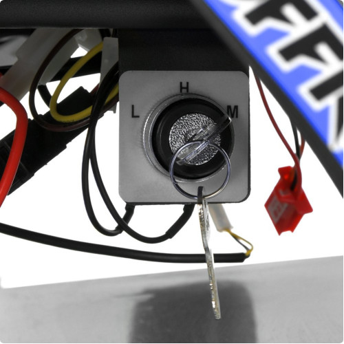 Модель оснащена мощным электродвигателем на 1000W, что позволяет развивать скорость до 25 км/ч. Предусмотрены три скоростных режима с возможностью переключения, что позволяет адаптировать поездку под уровень подготовки ребенка. Запуск осуществляется поворотом ключа, управление – с помощью ручки газа и тумблера движения вперед/назад.