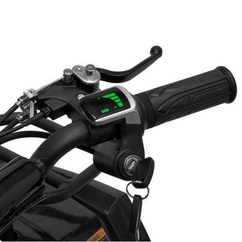 Модель оснащена мощным электродвигателем на 1000W, что позволяет развивать скорость до 25 км/ч. Предусмотрены три скоростных режима с возможностью переключения, что позволяет адаптировать поездку под уровень подготовки ребенка. Запуск осуществляется поворотом ключа, управление – с помощью ручки газа и тумблера движения вперед/назад.