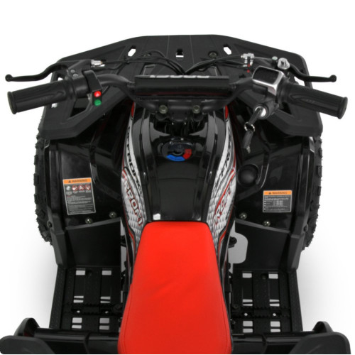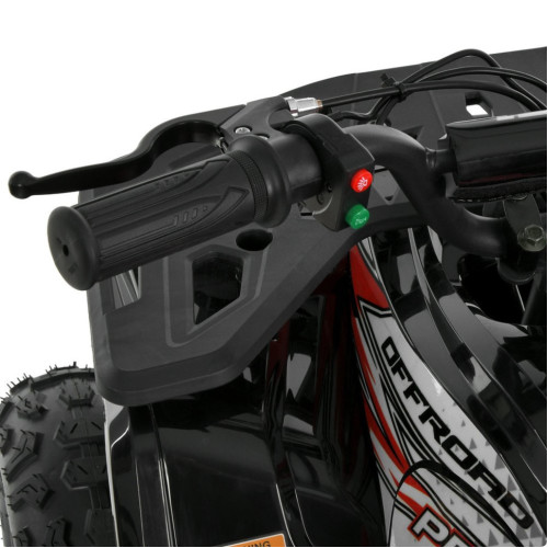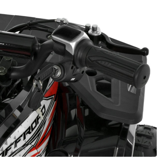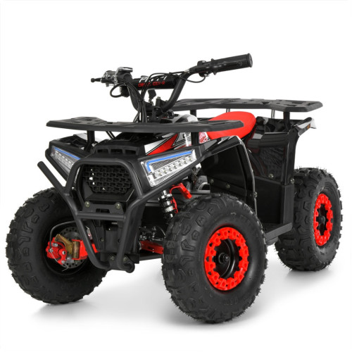 Квадроцикл оснащен бесщеточным двигателем мощностью 1000W и аккумуляторной системой на 48V, что позволяет развивать скорость до 25 км/ч. Предусмотрены три скоростных режима, которые переключаются поворотом ключа под сиденьем. Запуск осуществляется поворотом ключа, управления – с помощью ручки газа и кругового переключателя направления движения.