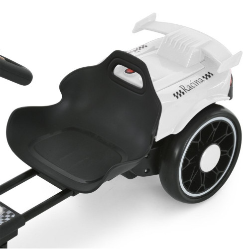 Электрокарт оснащен двумя моторами, обеспечивающими стабильное движение с максимальной скоростью до 5 км/ч. Управление осуществляется с помощью ручки газа на руле и кнопки переключения движения вперед/назад. Также предусмотрен пульт дистанционного управления.