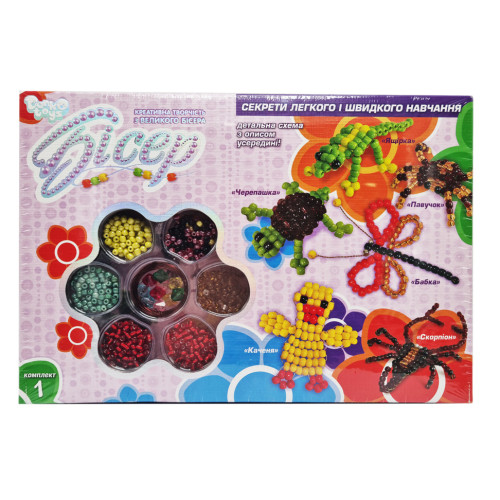 Набор для творчества «Бисер». В этом наборе Вы найдете множество бисеринок, которые отличаются по цвету и размеру, специальную прочную нить-леску для нанизывания бусинок, а также подробную инструкцию с описанием и схемами украшений, которые можно сделать с помощью этого набора.