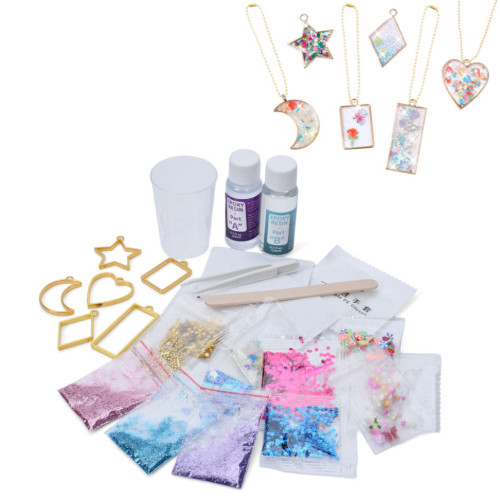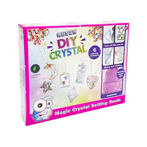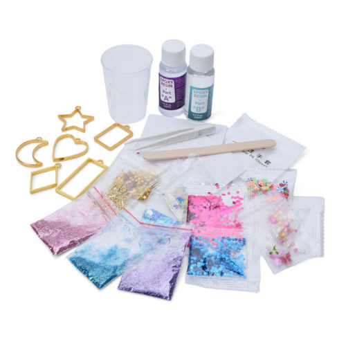 В наборе есть 6 форм для подвесок, глиттер, фигурки для украшения, цепочки, мерная чашка, инструменты, эпоксидная смола и активатор, что позволяет ребёнку создавать собственные уникальные украшения.