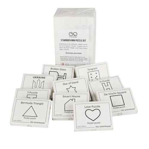 Набор мини-головоломок 12 Wooden mini puzzle set с заданиями на английском языке. В набор вошли самые популярные плоские головоломки, задачей которых является сложить фигурку, изображенную на упаковке. Такие пазлы-головоломки :-)