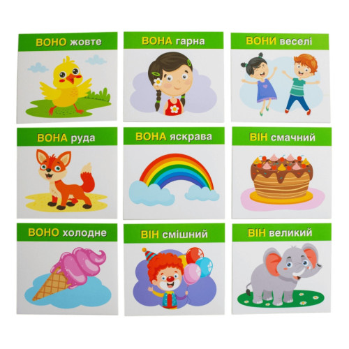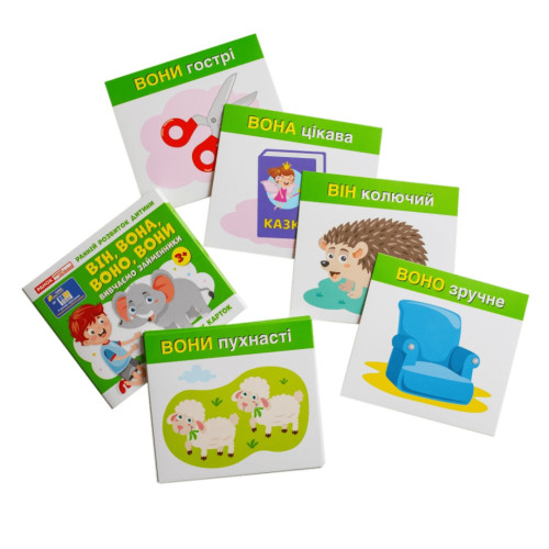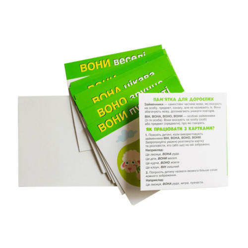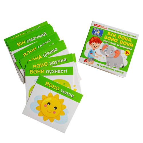 С помощью карточек, содержащих 15 ярких иллюстраций, малыши смогут легко распознавать и изучать местоимения ОН, ОНА, ОНО, ОНИ. Каждая карта содержит образы, которые помогают ребенку ассоциировать местоимения с реальными объектами или людьми.