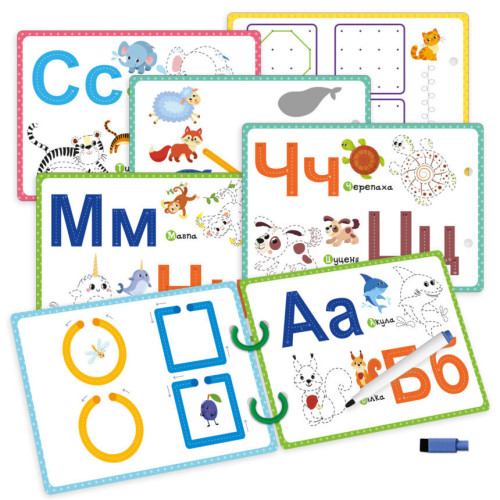 В наборе 9 крепких двусторонних страниц — всего 18 ярких картинок и 18 интересных задач. Ребёнок сможет изучать буквы, цифры и развивать мелкую моторику, выполняя упражнения на написание, рисование или счет.