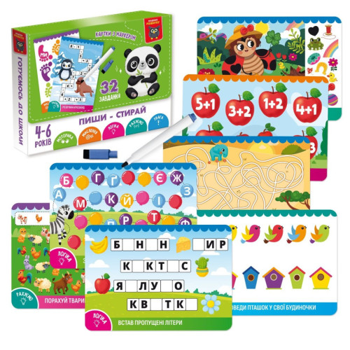 В наборе 16 страниц с 32 интересными задачами, которые помогут укрепить руку, развить координацию и мышление. Благодаря специальному маркеру, который легко стирается, ребенок может многократно выполнять упражнения, повторяя и усовершенствуя свои навыки в игре.