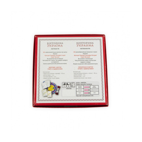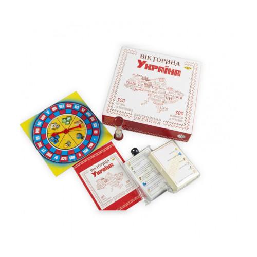 Лучшая настольная игра для маленьких и взрослых патриотов – набор «Викторина Украина» торговой марки «Мастер». Вся семья будет в восторге. Настольная игра не только прекрасно развлекает, но и помогает узнать больше о родине. Участникам предстоит сразиться в эрудиции. Викторина посвящена Украине. Здесь будут вопросы на разные темы: культура, география, природа, спорт, история. Какие задачи получит каждый конкретный участник – решает игровая рулетка. Возвращаем ее и получаем результат. Задания написаны на карточках. Они изготовлены из качественного крепкого картона, который переживет не одну сотню игр.Интересных вопросов много. Наверное, даже лучшим знатокам украинских загадок придется поломать голову над некоторыми задачами. Время ответа ограничено. Его отмеряют песочные часы, которые также входят в набор. Можно устроить поединок для двоих или викторину для большой компании. Скучать точно не придется. Играть можно на украинском или русском языке