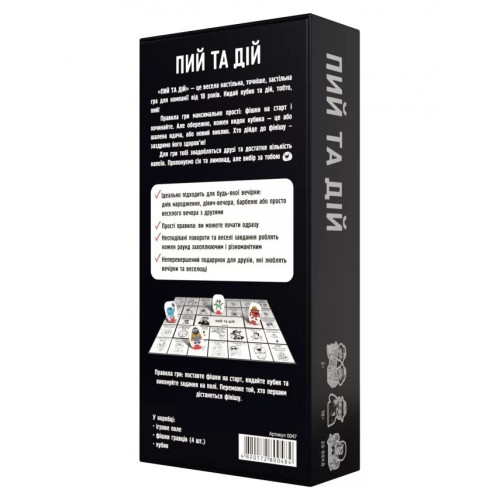"Пей и Действуй" – это настольная, а точнее застольная игра для компании от 18 лет, где каждый бросок кубика может изменить ход событий. Кто пьет? Кто выполняет задание? Повезет ли вам в этот раз или нужно повторить? Игра полна неожиданных поворотов, шуток и смешных ситуаций.