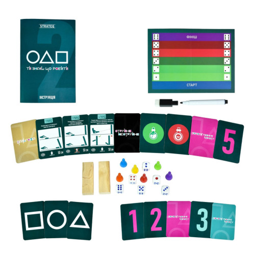 ♦ Комплектация: коробка, игровое поле, игральные кубики - 6 шт., фишки - 6 шт., деревянные бруски - 2 шт., маркер, карточки 54 шт., прозрачная карточка, инструкция.