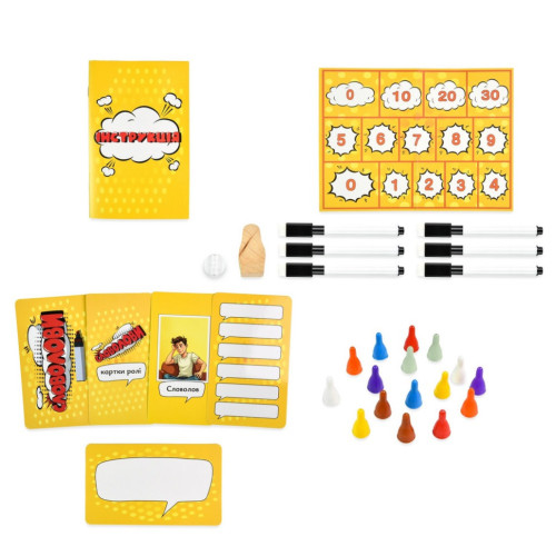 ♦ Комплектация: коробка, карточки ролей – 8 шт., карточки для написания – 6 шт., маркеры – 6 шт., игровое поле, фишки – 16 шт., фишка первого игрока, подставка, инструкция.