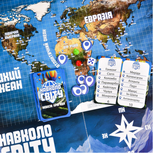 Комплектация: коробка (изготовлена из картона), карточки маршрутов — 36шт., жетоны — 40шт., карта мира, компас, кубик, фишки — 4шт, инструкция.