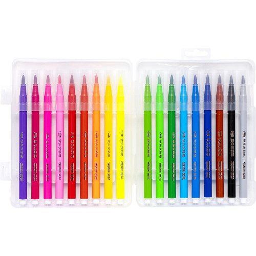 Набор включает 18 фломастеров-кисточек разных цветов. Они оснащены узлом в форме кисточки, что позволяет наносить линии шириной от 1 до 4 мм. Чернила изготовлены на водной основе. Размеры бокса: 14,5*18*3 см.