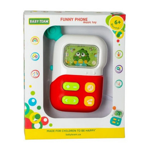 BABY TEAM Игрушка музыкальная в виде телефона со световым эффектом привлечет внимание малыша и очарует разнообразными мелодиями и звуками. Музыкальная игрушка развивает координацию движений, концентрацию, внимание, мелкую моторику, слух и цветовое восприятие. Необходимо ААА х 2 батарейки (входят в комплект только для демонстрации функций). Игрушки BABY TEAM изготовлены из высококачественных и безопасных материалов, а также не содержат вредных веществ и Бисфенол А.