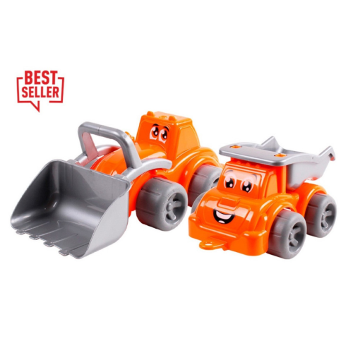 Набор из двух машинок - самосвала и трактора. Всё необходимое для того, чтобы начать стройку в песочнице.