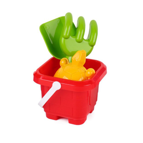 В наборе квадратное ведерко, дизайн которого имитирует кладку средневековой башни, маленькие лопатка и грабельки, и формочка для песка. Ведерко можно использовать как формочки для песка и построить настоящие большие башни.