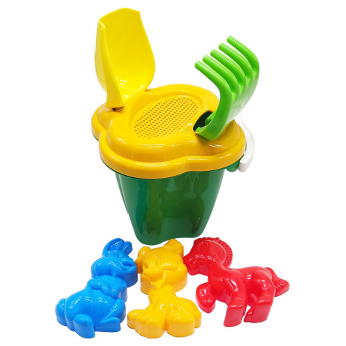 Песочный набор "Колокольчик" №1. Яркий, привлекательный набор, состоящий из ведерка оригинальной, "цветочной" формы, грабелек, лопатки, сита и трех пасок в виде симпатичных зверят, обязательно понравится вашему малышу и займет достойное место в коллекции любимых игрушек. Такой комплект - необходимая вещь для увлекательных игр в песочнице или для строительства на пляже.