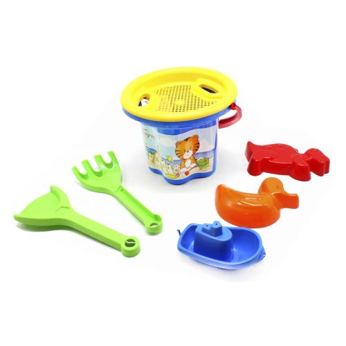 Комплектация: Ведро, лопатка, грабли, ситечко, 2 формы для песка, кораблик