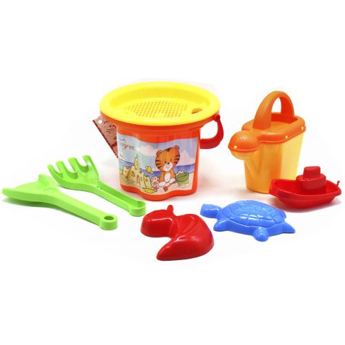 Комплектация: Ведро, лопатка, ситечко, грабли, 2 формочки для песка, лейка и кораблик