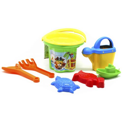 Комплектация: Ведро, лопатка, ситечко, грабли, 2 формочки для песка, лейка и кораблик