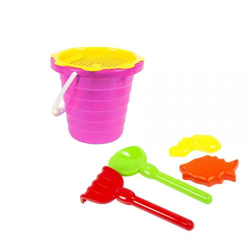 Песочный набор, средний. Набор включает в себя 6 элементов: ведро (16 х 16 х 14 см), лопатка и грабли (24 см), сито, 2 пасочки.