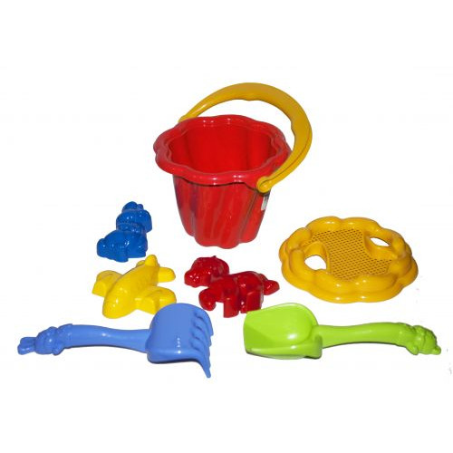 Песочный набор "Ромашка" №1. В набор входит: ведро с ситом, грабли, лопатка и 3 пасочки. Подходит для игры дома, на улице, в саду и на пляже. Размер лопатки и грабелек - 21 см, размер пасочки - 10 - 12 см, ведро -16 х 16 х 12,5 см._
