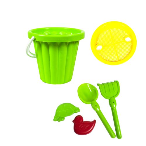 Набор для песка. 3 вида. Ведерко, пасочка 2 шт., лопатка, сито, грабельки. Пластик.
