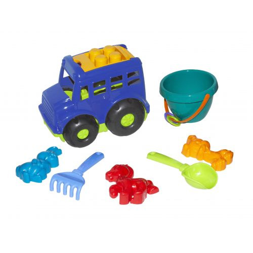 Комплектация: Машинка, ведёрко, лопатка, грабельки, 3 пасочки