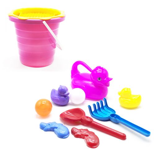 Комплектация: пластиковое ведёрко, ситечко, лопатка, грабельки, 2 пасочки, 2 пластиковых мячика, 2 уточки